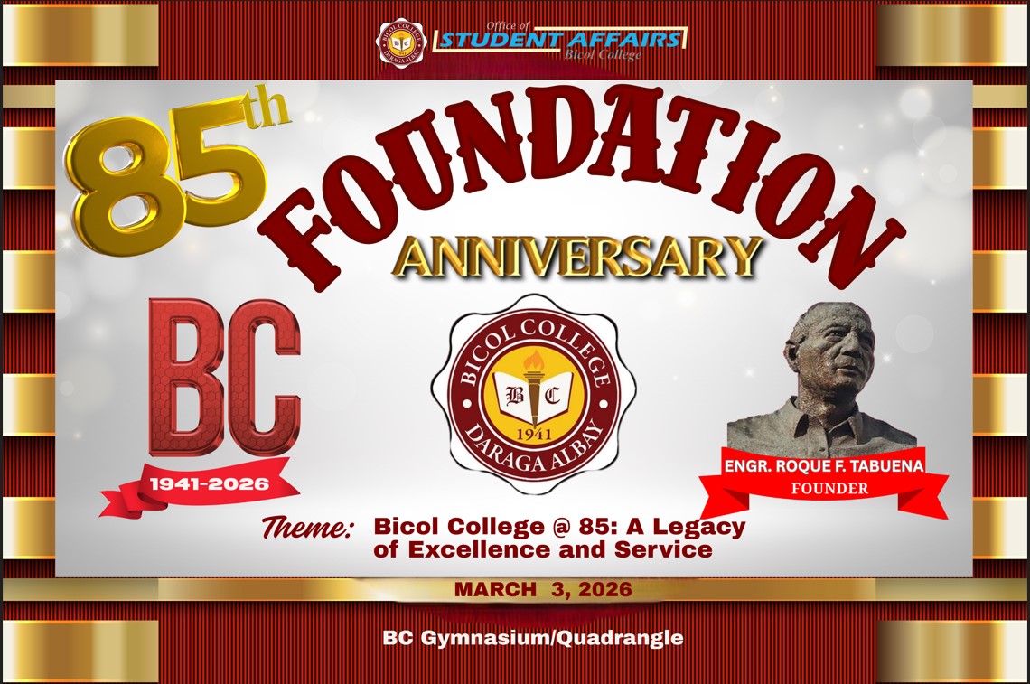 Bicol College marks its 85th Founding Anniversary today, March 3, 2026, highlighted by the unveiling of the monument of its founder, Engr. Roque F. Tabuena.